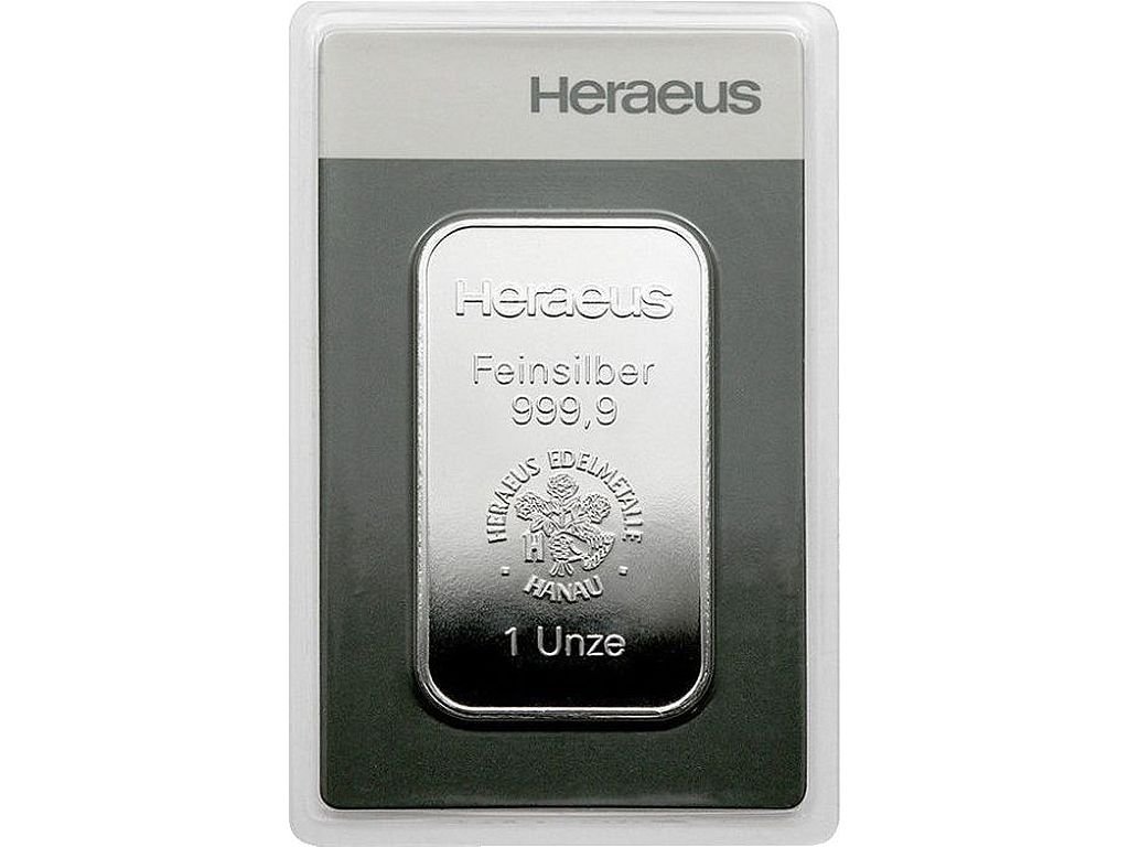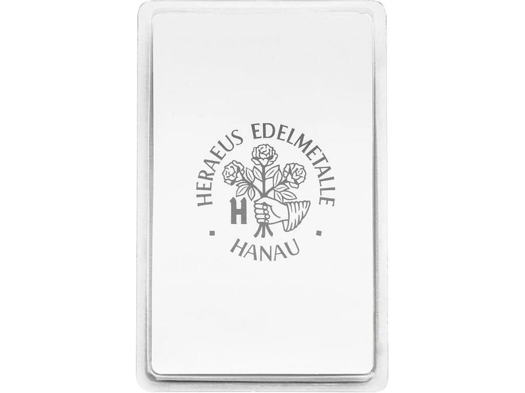 Stříbrný slitek o hmotnosti 1 oz (31,1 g) renomovaného výrobce Heraeus v plastovém transparentním blistru 85 x 54 mm.