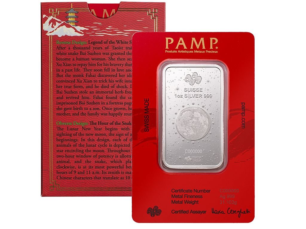 Stříbrný slitek o hmotnosti 1 oz renomovaného švýcarského výrobce PAMP (Produits Artistiques Métaux Précieux, v překladu Umělecké produkty z drahých kovů) ve speciální ochranné plastové ASSAY kartě 86 x 54 mm, která zároveň slouží jako certifikát autentičnosti.